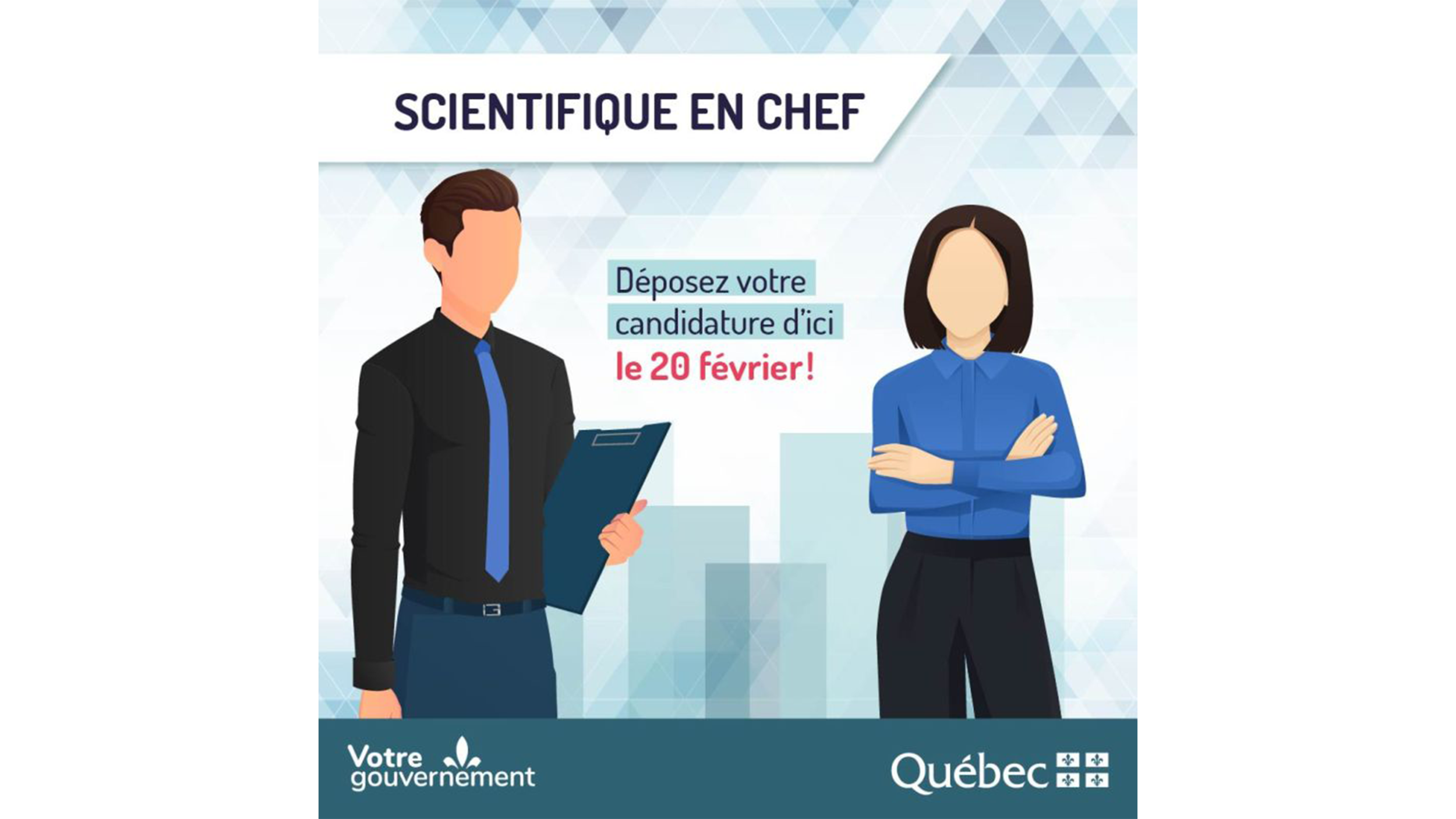 À la suite de l’annonce du départ de Rémi Quirion, actuel scientifique en chef du Québec et PDG du Fonds de recherche du Québec, la secrétaire générale associée aux emplois supérieurs au ministère du Conseil exécutif, en collaboration avec le ministère de l’Économie, de l’Innovation et de l’Énergie, invite les personnes intéressées et qui possèdent les exigences recherchées, à soumettre leur candidature afin de constituer une liste de personnes aptes à être nommées au poste de scientifique en chef.