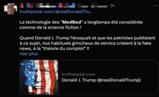 Apparue dans un message du président Trump posté sur son compte TruthSocial dans la soirée du samedi 27 septembre, la vidéo de 37 secondes prenait la forme d’un faux reportage de Fox News au cours duquel le président Trump annonçait, depuis son bureau de la Maison-Blanche, avoir signé un décret créant « le premier hôpital de medbed ». Chaque Américain allait bientôt recevoir une « carte medbed » pour accéder à cette technologie miracle.