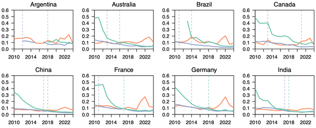 Mais la tendance à la baisse dure depuis au moins 15 ans. Le coût du solaire a ainsi rejoint celui des carburants fossiles vers 2017 en France, et vers 2021 au Canada et aux États-Unis, selon les tableaux ci-dessous, extraits du dernier rapport des Nations unies (page 9). Le coût des renouvelables, lit-on par ailleurs dans le rapport de l’IRENA, a diminué de façon « spectaculaire » depuis 2010 (date des premières données sur la question), « grâce à des améliorations technologiques, à des chaînes d’approvisionnement compétitives et à des économies d’échelle ». En particulier, « 91% des nouveaux projets d’énergies renouvelables décidés en 2024 étaient plus rentables » que tous les projets liés aux carburants fossiles.