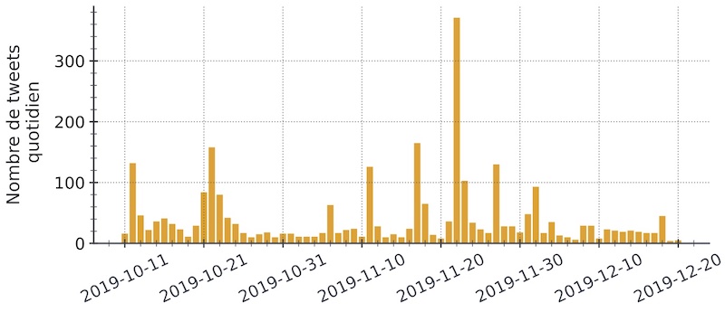 Nombre de tweets décrivant le CO2 comme une « nourriture pour les plantes » par les « dénialistes », octobre-décembre 2019. David Chavalarias et al., CNRS, 2023.