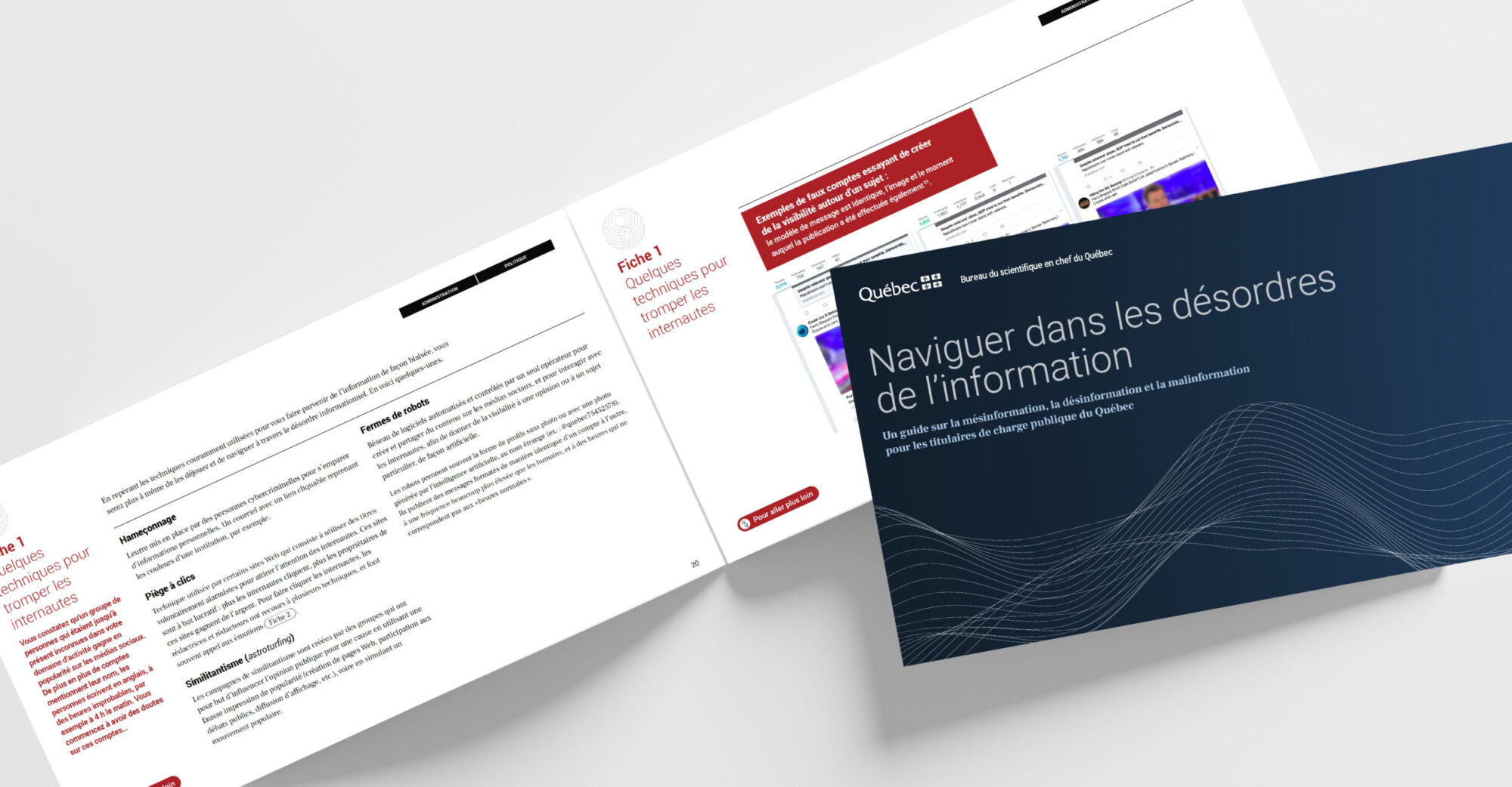 C’est pourquoi le bureau du scientifique en chef du Québec a développé le guide Naviguer dans les désordres de l’information, qui vise à renforcer le discernement individuel et organisationnel des titulaires de charge publique au Québec, en proposant des pistes d’action concrètes dans les domaines juridiques, numériques, de la communication et du sens critique.